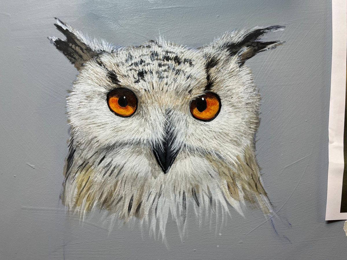 Wildlife picture of an owl done in 90 minutes in acrylics – not that it was against the clock!
